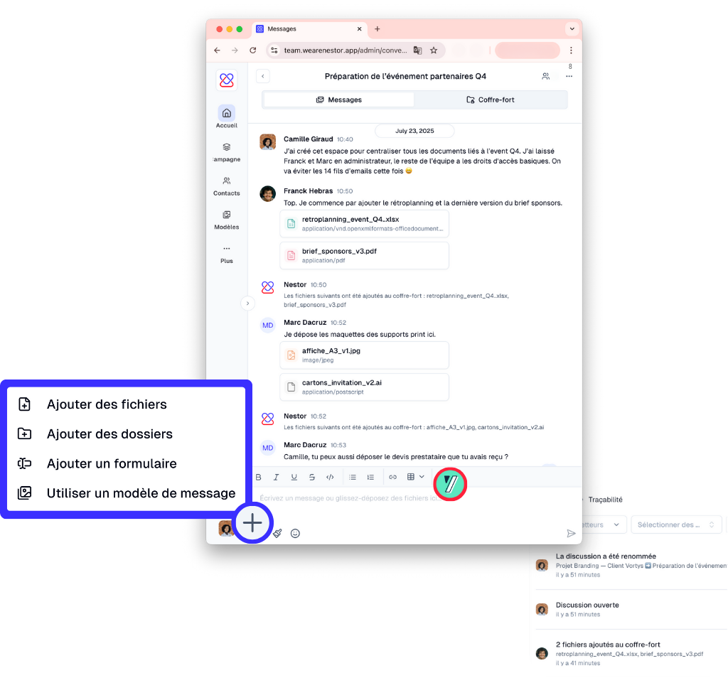 Nestor crée des espaces d’échange structurés, conçus pour gérer les échanges critiques (documents sensibles, signatures, relances...) dans un cadre conforme et traçable. Ce n’est pas un mail, c’est un environnement sécurisé adapté à vos processus.