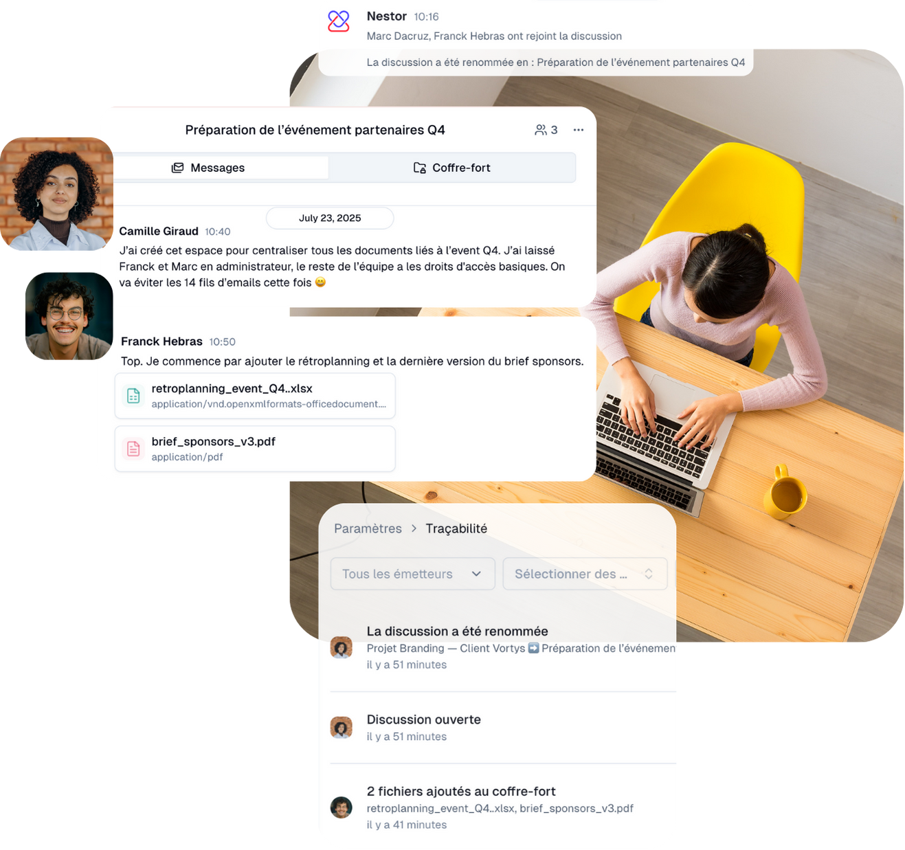 Nestor permet de créer des espaces collaboratifs sécurisés pour répondre à un besoin simple : remettre de la structure, de la preuve et de la sérénité dans les échanges professionnels.