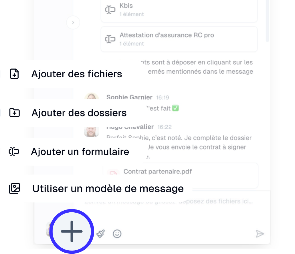 Sollicitez des documents de manière sécurisée en ouvrant un espace de dépôt dans la conversation. Une solution simple et conforme pour récupérer les pièces nécessaires.