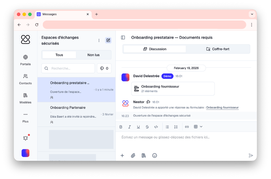 Quand la relation se poursuit, le Portail devient le point d'entrée vers un Espace d'Échange Nestor complet. L'historique du premier échange est déjà documenté.