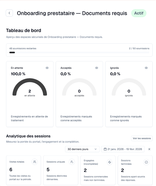Chaque document déposé remonte dans un tableau de bord unique. Taux de complétion, dossiers manquants, alertes d'inactivité, le suivi se fait en temps réel, sans relances manuelles.