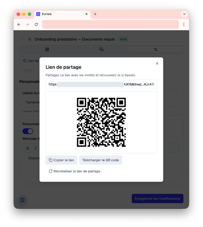 Le Portail génère un lien sécurisé que vous déployez là où se trouvent vos interlocuteurs : page de votre site web, corps d'un email, signature de mail, QR code. Le point d'entrée s'adapte à vos process existants.